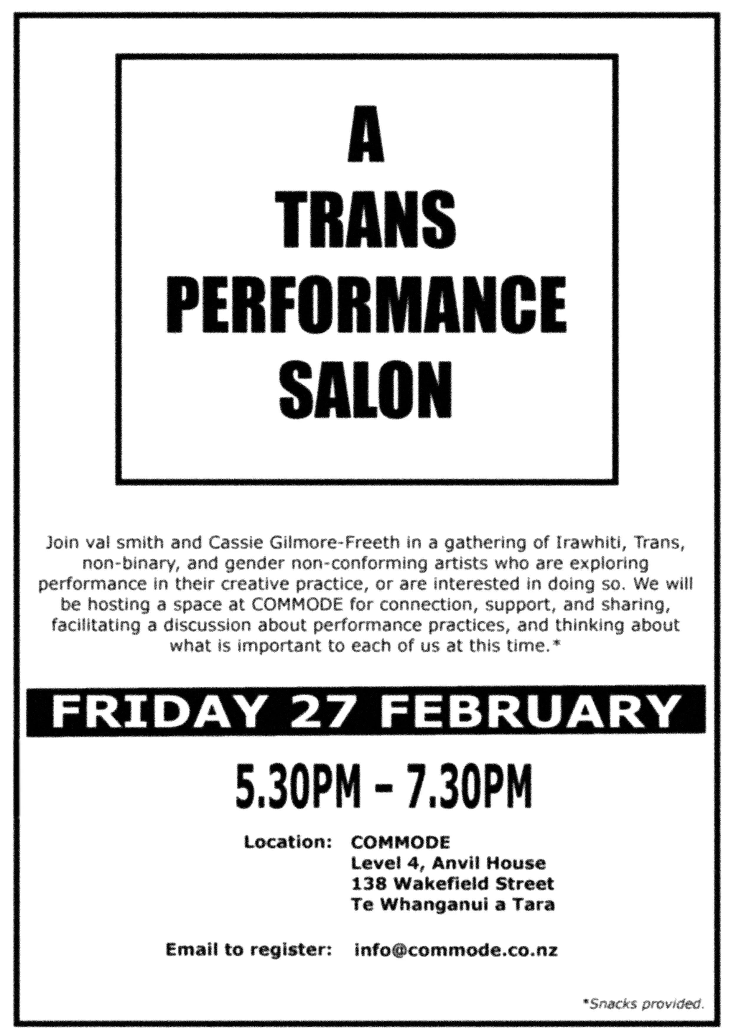 Join val smith and Cassie Gilmore-Freeth in a gathering of Irawhiti, Trans, non-binary, and gender non-conforming artists who are exploring performance in their creative practice, or are interested in doing so. We will be hosting a space at COMMODE for connection, support, and sharing, facilitating a discussion about performance practices, and thinking about what is important to each of us at this time.